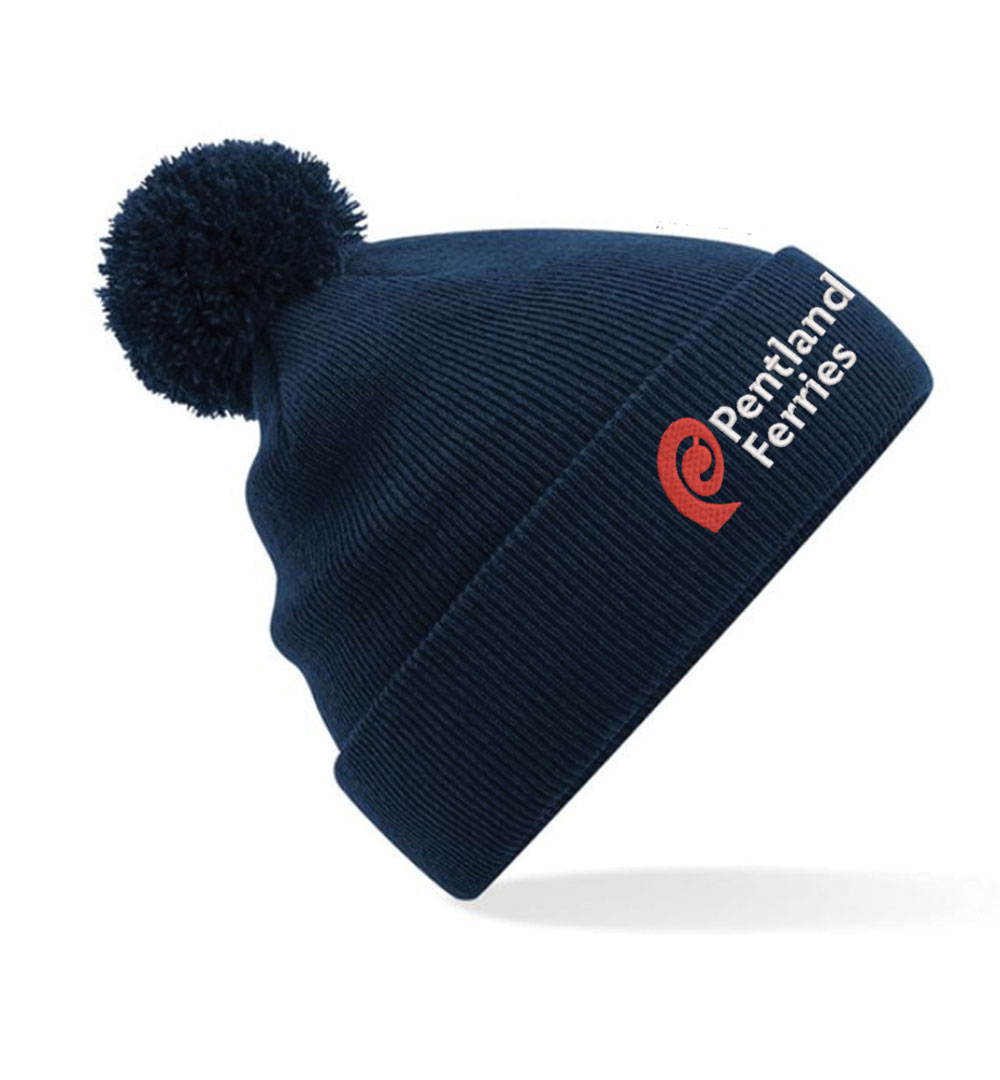 Bobble hat in navy with Pentland Ferries logo embroidered on the front. 100% Soft-touch acrylic. Fits ages 3 – 12.